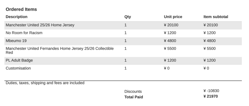 注文詳細を見てみると、背番号のプリントについて2行書いてあり、片方はフリー(無料)と出ているが、もう片方でしっかりお金を取られている。
